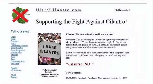 由于对香菜的极度仇恨,反香菜党甚至在互联网上建立了一个“反香菜联盟网站”。 上面有一个版块,里面有很多痛恨香菜的人分享他们的“血泪史”,这个板块的名字就叫做“香菜有多难吃?请说出你的故事。”每天都有网友分享他们自己的悲惨经历......其他网民的金句也是一个接一个的好玩:“世界上所有的东西都是大自然的馈赠,除了香菜!”
