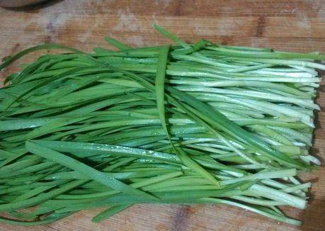 制作过程:第一步,将韭菜割下来后,择好,再用清水仔细的冲洗干净泥土,沥干水分;