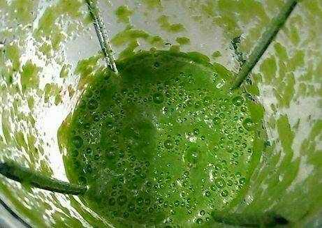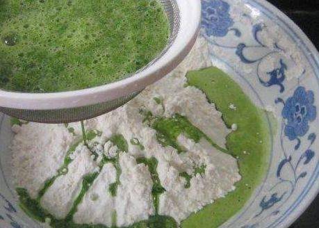 第三步,搅打好的韭菜浆,用筛网过滤一遍,取过滤好的韭菜汁水用;