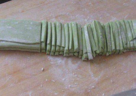 第六步,时间差不多后,将面团移至在案板上,用擀面杖将其擀成面皮,再将擀好的面片,切成粗细均匀的条;