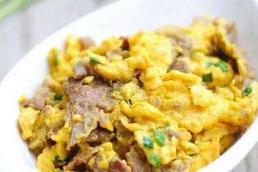 6、炒锅里倒油烧热,倒入含有牛肉片的蛋液翻炒。