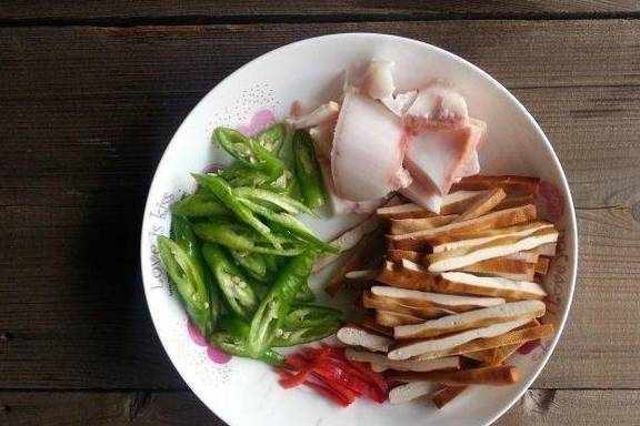 材料:香干3块、线椒4个、五花肉1小块、红辣椒1个、味精1小匙、盐少许