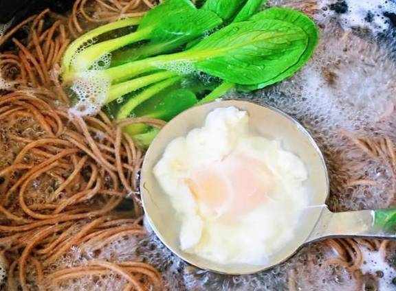 3、锅中水开煮荞麦面,顺便烫点青菜、煮一个荷包蛋面煮熟捞出过凉水沥干