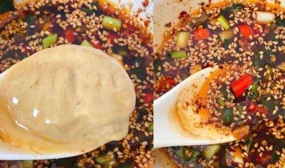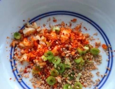 1、碗中放一一勺白芝麻,勺辣椒粉,一勺小葱,一勺蒜末、半勺花椒粉,淋上一勺热油备用