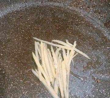 2、将姜片切丝,锅里放少许橄榄油热锅,倒入姜丝香煎一会。