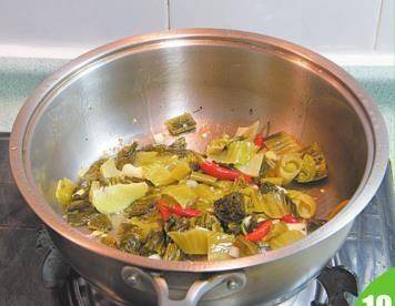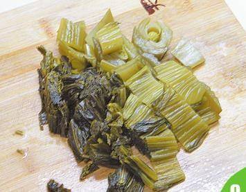 9 酸菜洗净,切成段。