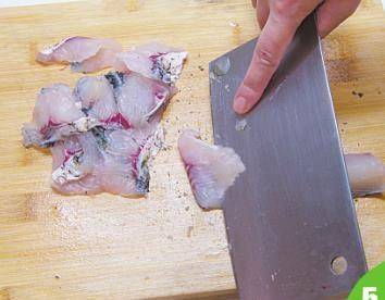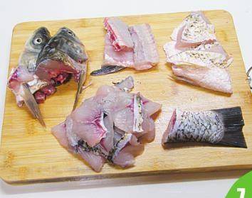 7 将鱼分成鱼头、鱼尾、鱼骨、鱼腩(肚)、鱼片5部分。