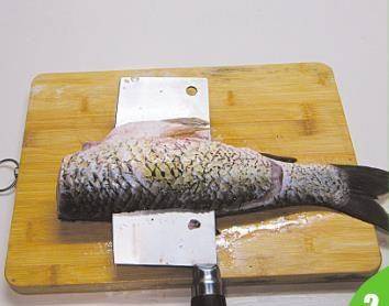 1 草鱼剖肚,去内脏、鳃,刮净鱼鳞,洗净,斩下鱼头。
