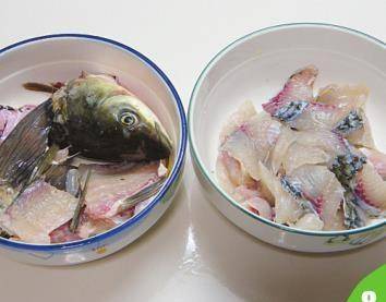 8 将鱼头、鱼尾、鱼骨、鱼腩放在一个碗内,鱼片放在另一个碗内,分别用调料A腌制10分钟。
