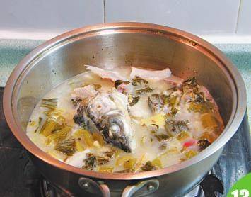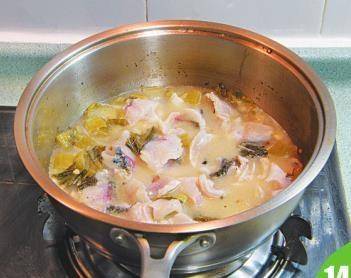 13 再放入鱼腩、鱼尾及炒好的酸菜,调入盐、鸡精、白胡椒粉。