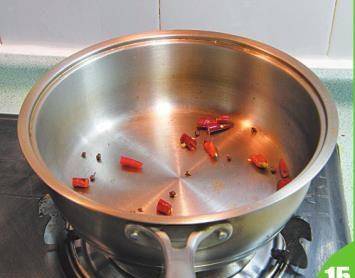 15 坐锅点火,将干红椒及花椒放入锅中略爆香,捞出,放在鱼片上。