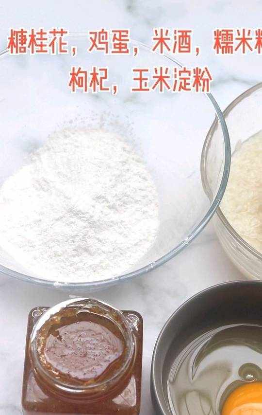 江米酒300克、糯米粉90克、温水70克、糖桂花2勺、白砂糖3勺、枸杞适量、玉米淀粉适量、水适量、鸡蛋1个