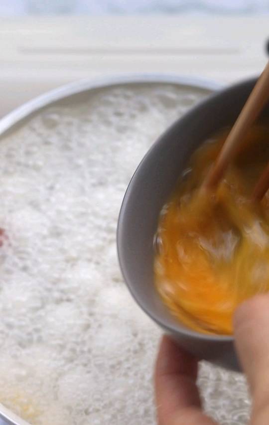 9.煮开后,倒入鸡蛋液。快速搅拌均匀,形成蛋花!