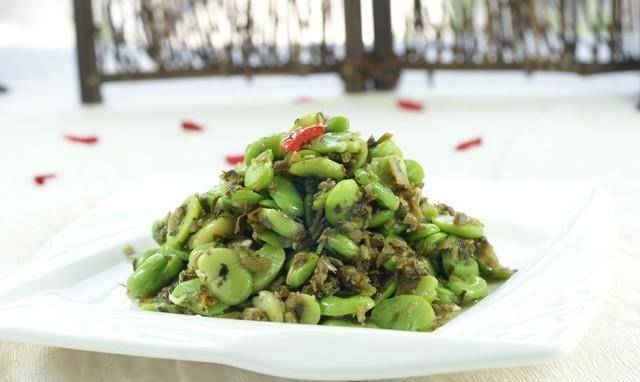 ②、起锅倒入食用油,油热下入胡豆米,翻炒至断生,再加入酸菜,红椒翻炒均匀,加入食盐生抽,翻炒入味翻盘。