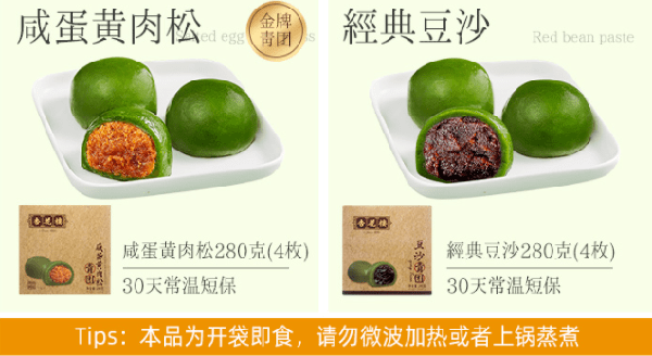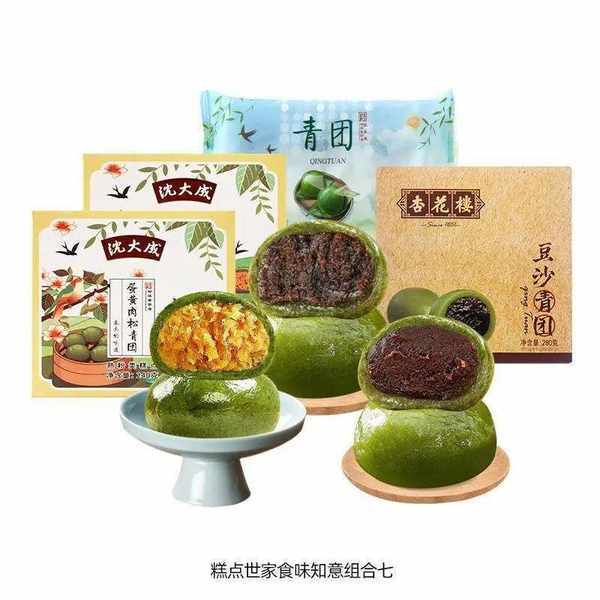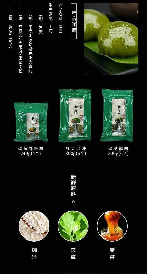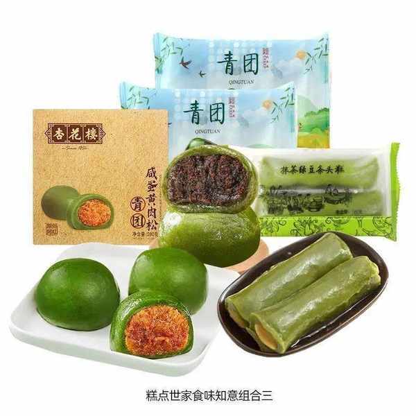 规格:豆沙青团240g/盒*3盒+蛋黄肉松青团240g/盒*2盒+芝麻味青团240g/盒*1盒