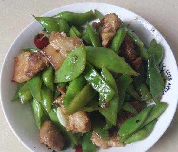 2、热锅凉油放入猪肉片,炒至肉变色再放入扁豆翻炒均匀