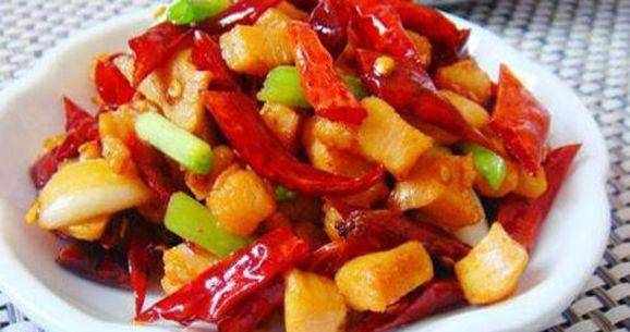 2.锅烧热倒油,油七层热就倒入鸡丁、炸至表面呈金黄,将鸡丁捞起。锅里留少许油,倒入姜蒜、干辣椒、加花椒、炒出麻辣的香味即可