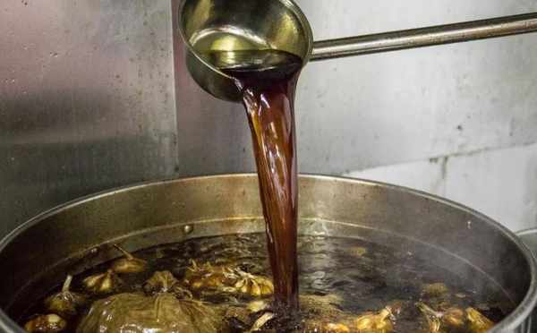 锅中加入一点食用油,放入冰糖慢慢翻炒,待冰糖开始变色、冒泡我们在锅中加入开水,搅拌均匀后倒进卤锅中,充分的与高汤或者卤汤融合。