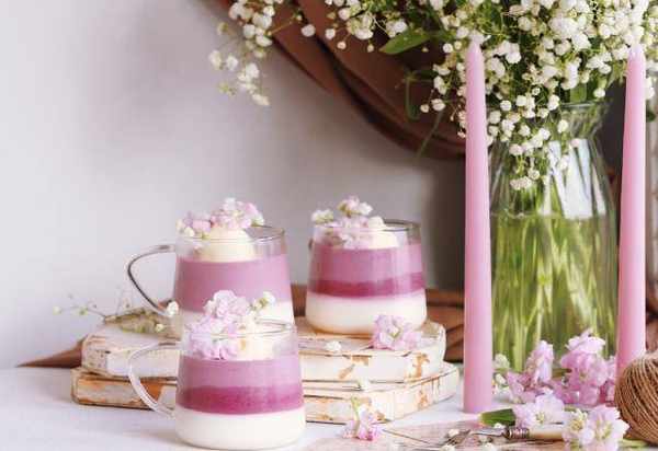 准备一些紫罗兰,用水洗净,晾干,用塑料薄膜包住花茎,插在冰激凌球旁边装饰。