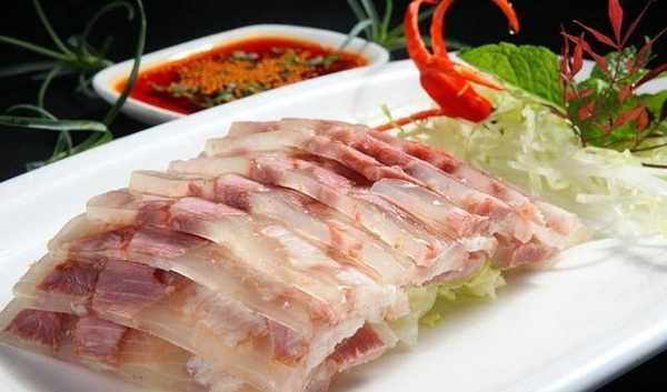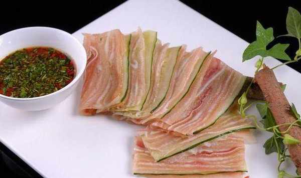 锅中烧水,水开后放入猪皮蒸2个小时,把蒸好的猪皮和猪肘放到一个容器中,自然晾干后,放进冰箱冷藏一晚。取出切成片,摆在盘中,即可食用。