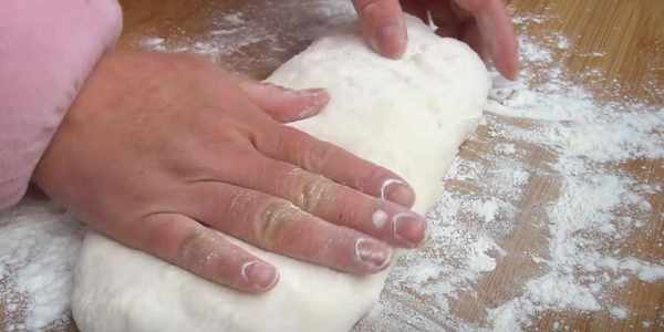7.手上也拍点干粉,把它整理成长条状。再次粘手就继续撒干粉。