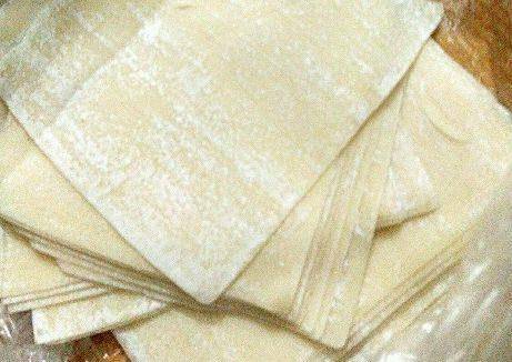 第五步,超市买回的馄饨皮取出来,一张馄饨皮,在四周抹上些许的清水,中间放上馅料;