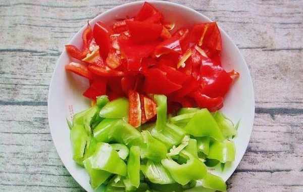 3、将青椒和红椒去根蒂,清洗后,切成薄片。洋葱切片,小葱切段,生姜切片,大蒜切片,备用。
