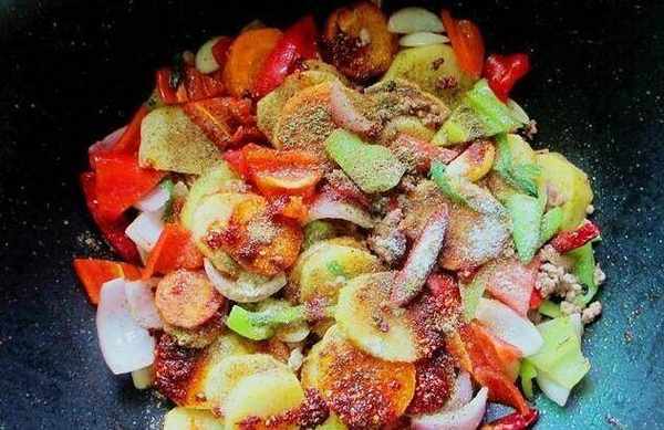 材料:土豆,胡萝卜,猪肉末,洋葱,大蒜,葱,姜,干辣椒,老干妈酱,鸡精,五香粉,糖,蚝油,味极鲜,熟芝麻。