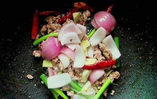 4、将少许油倒入锅中,油加热后,加入肉沫翻炒至变色,加入葱姜蒜,干辣椒和老干妈翻炒出香味。