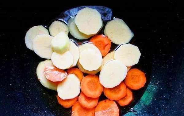 2、将锅中多倒入一点油,当油温为60%时,加入土豆片和胡萝卜片,用小火煎炸到表面微黄,捞出来,备用。