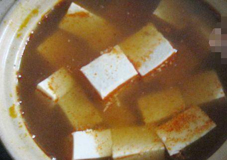 第三步,待水煮开后,先将清洗干净切好的豆腐块放入,继续煮,待锅再次开后;