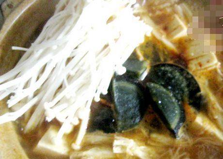第四步,转至小火煮10分钟,下入皮蛋,一同再加上处理好的金针菇;