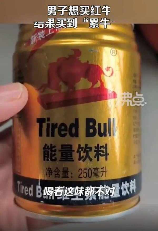注意看,视频中图标是一个红色的牛,但这个牛,显然和红牛上面的牛有些差异 ,其次就是字母。红牛的是“red”,而男子购买的则是“tired”。后面的品名则写着”累牛”。男子也是吐槽道,自己都被逗哭了,喝完就累呗?