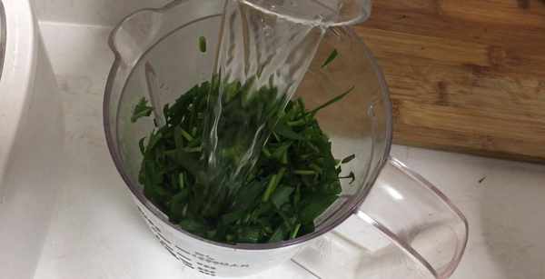 切好的浆麦草放进料理机。加入200克清水,一点点食用碱防止变色,打成汁。