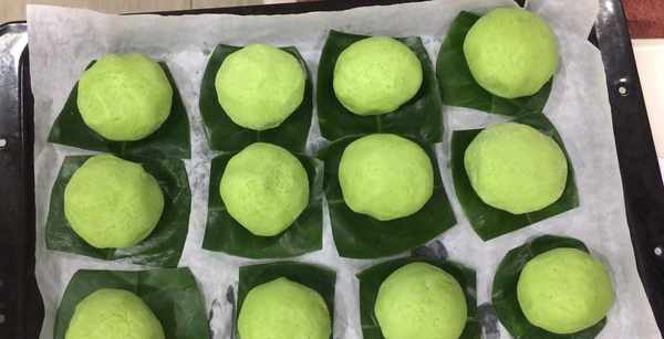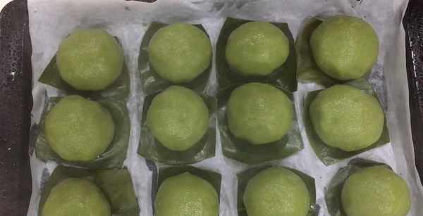 准备一些柚子叶,柚子叶有种特殊的香味。如果没有柚子叶就用粽叶,都没有就用硅油纸,剪成适合的大小,青团放上面,放入蒸锅。锅开后蒸12分钟。