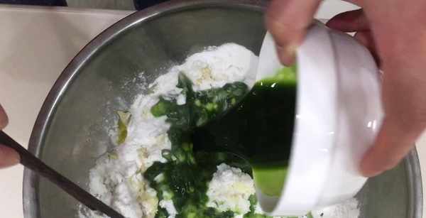 倒入200克糯米粉,10克食用油(用猪油更香),150克浆麦草汁,和成偏软的面团。面粉的吸水量不一样,如果太软适当的加入一些糯米粉。