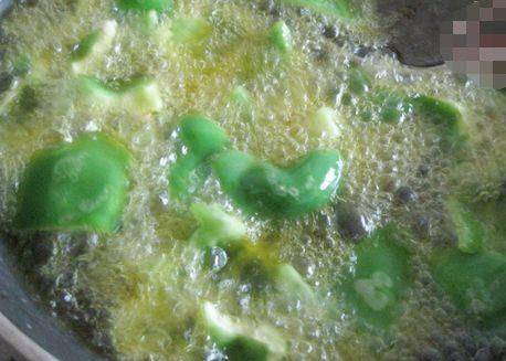 第五步,下入青椒块,待颜色一变深色,便立马捞出来控油;