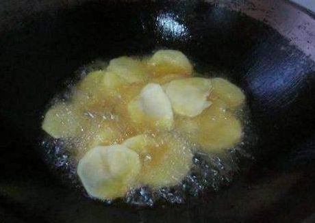 第三步,锅中添上比较多点的油,待油温烧至中高温的时候,放入切好的土豆片进行炸制,待表面微焦的时候捞出;