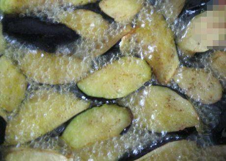 第四步,接着再放入切好的茄子,注意观察油在炸制时候的气泡,由大气泡变成小气泡的时候,捞出来控油(这一步很关键,大家需要注意);