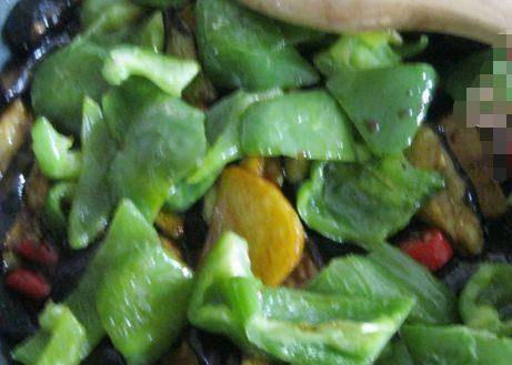 第七步,依次下入炸好的青椒、茄子和土豆片,加上少许的盐、五香粉,翻炒均匀;