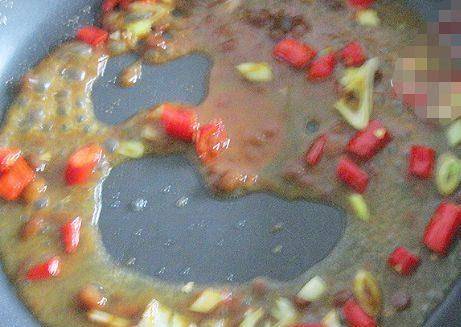 第六步,重起一锅,在锅中放上适量的黄豆酱,再下入辣椒和葱花,爆炒出香味后,加上少许的老汤;