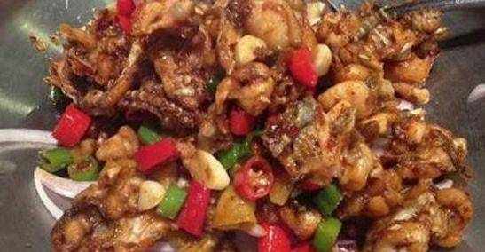 4.加入牛蛙翻炒断生。依次加入香锅料、香辣酱、啤酒、老抽、糖、鸡精大火翻炒几分钟收汁。