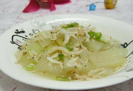 4、加小半碗水,加少许盐,大火烧冬瓜微烂后倒入虾皮,混炒后撒些葱花即可上桌。