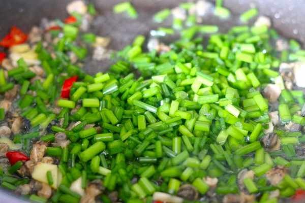 3、倒入准备好的螺蛳肉,大火开始煸炒,放入香醋,然后来点料酒,接着放入韭薹,开始翻炒。