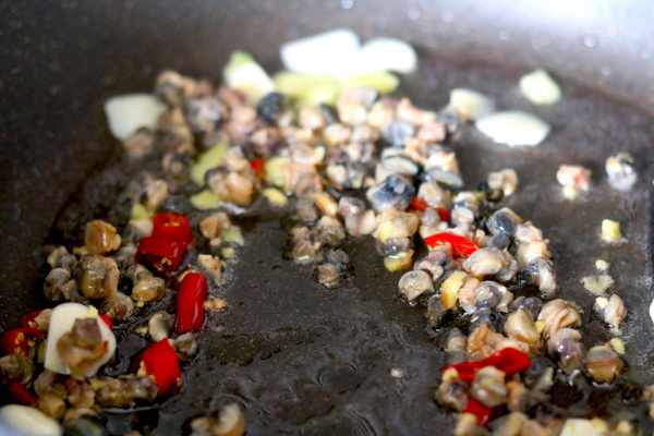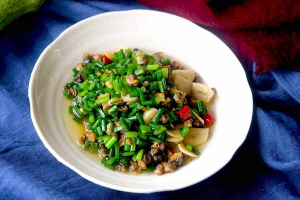 所需食材:螺蛳肉、韭薹1把你、蒜片、姜片、小米辣;菜籽油、盐、酱油、料酒、香醋半勺、鸡粉2克