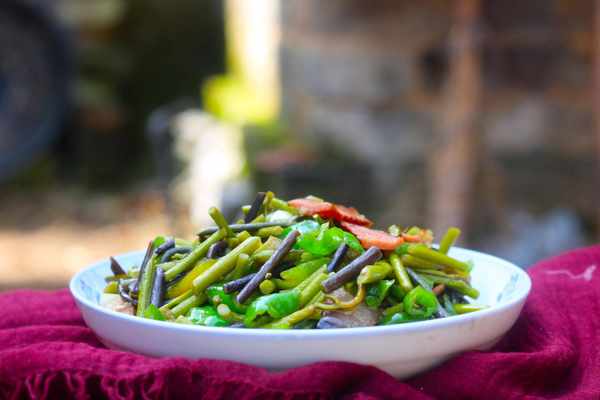所需食材:蕨菜1把、腊肉20克、青辣椒2个、植物油、盐、酱油、鸡精少许