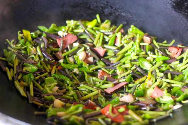 3、锅中放入植物油,烧热之后,放入腊肉煸炒,炒香之后,倒入蕨菜开始翻炒,然后放入辣椒块。