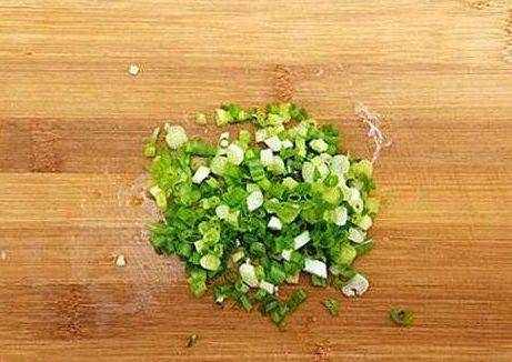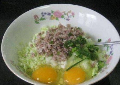 第四步,再磕入2个鸡蛋,香葱切成末后,也加放在白菜面粉中;