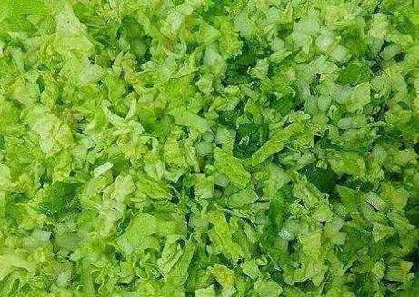 第二步,沥干水分的大白菜,放在案板上,用刀将其切成碎末,放在盛有面粉的碗中;