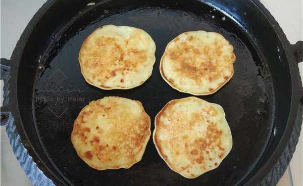 平底锅烧热,涂抹一些植物油,用勺子舀上一些面糊倒入锅中,先别急着翻面,待表面起小泡泡底面定型,翻面烙至两面微微发焦熟透即可。